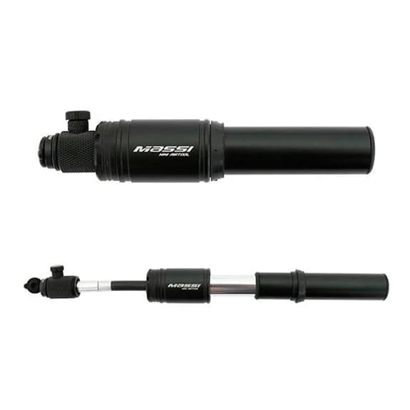 La pompa a mano Massi Telescopica CM32 Alluminio Doppia Valvola è compatibile con le valvole Presta e Schrader. Ha il corpo in alluminio e ha una lunghezza di 230 mm. Questa pompa a mano è telescopica e ha e un tappo antipolvere.